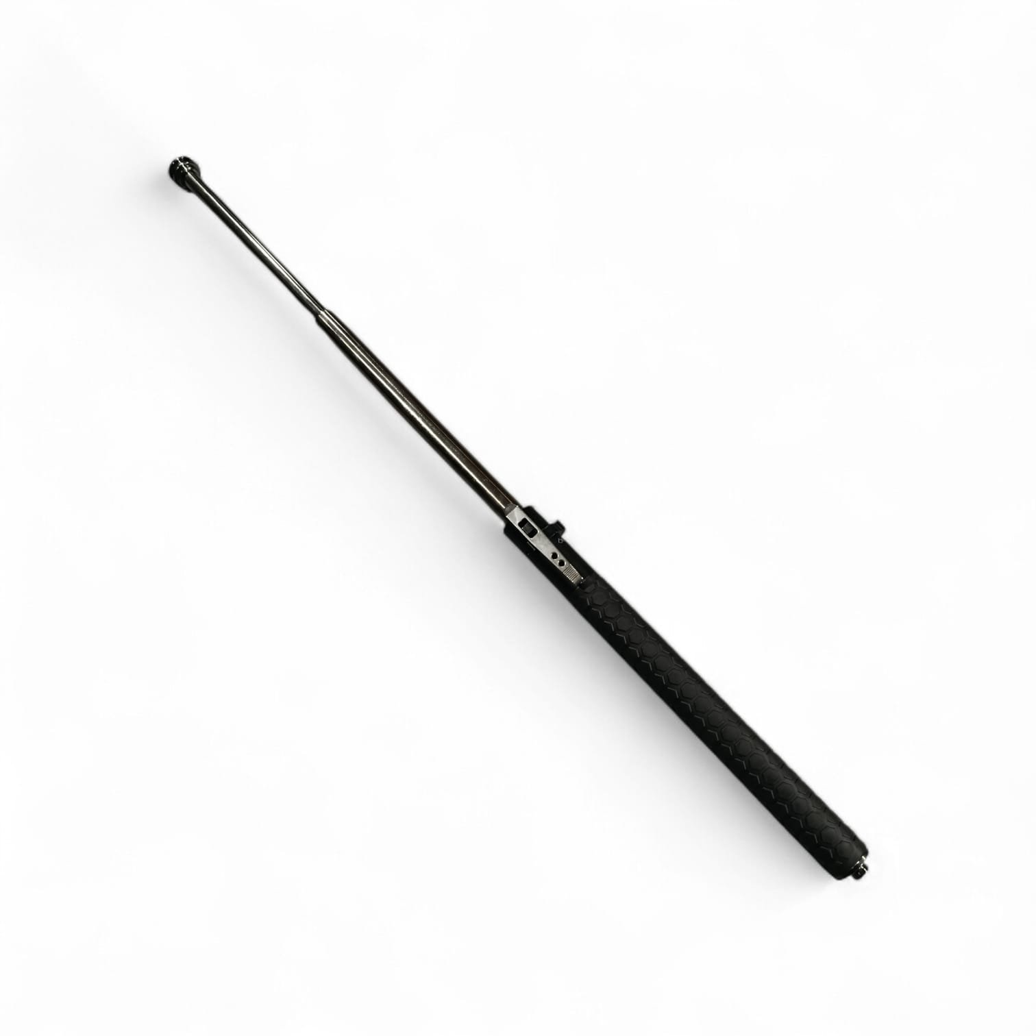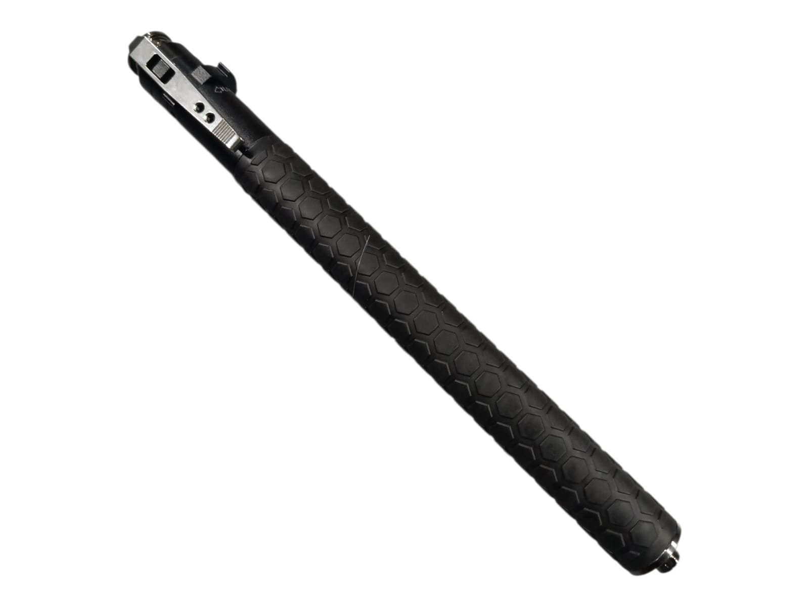 Tambo/Baston automatico perfecto para defensa personal, fabricado en acero cromado, con gancho para llevar en cinturon, y seguro manual, tambn tiene rompevidrio y un agarre antideslizante.